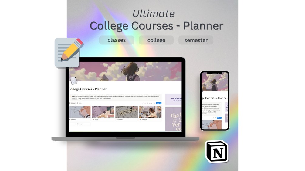 This Notion college course planner is designed to streamline your academic journey with essential features tailored for students. The planner includes a dynamic calendar to schedule classes, assignments, and study sessions effectively. A countdown timer for the end of semester helps you stay aware of important deadlines and exam dates. The Courses button organizes your courses neatly, allowing you to easily access syllabi, lecture notes, and project details. Additionally, the Professors category enables you to track and manage contact information, office hours, and communication regarding course-related queries. This comprehensive planner ensures you stay organized, focused, and on top of your academic responsibilities throughout the semester.